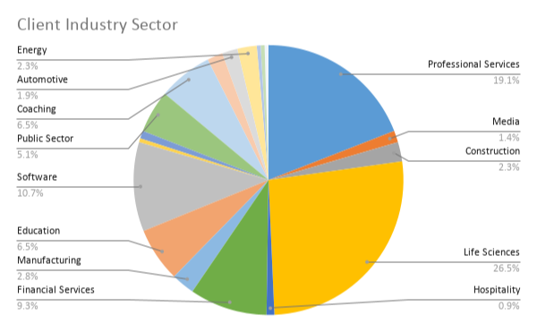I have a pharma and life sciences background, so unsurprisingly 27% of clients come from these industries.